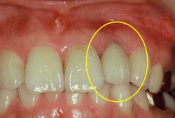 丸の歯は、根っこが折れていて痛みが出ていました。このような場合抜歯(歯を抜くこと)になるのですが、その後歯がなくなったところは、以前では、両隣のきれいな歯を削る「ブリッジ」と言う治療を行っていたのですが、現在インプラント治療が出てからは隣の歯を削ることなく歯を入れることが可能になりました。
